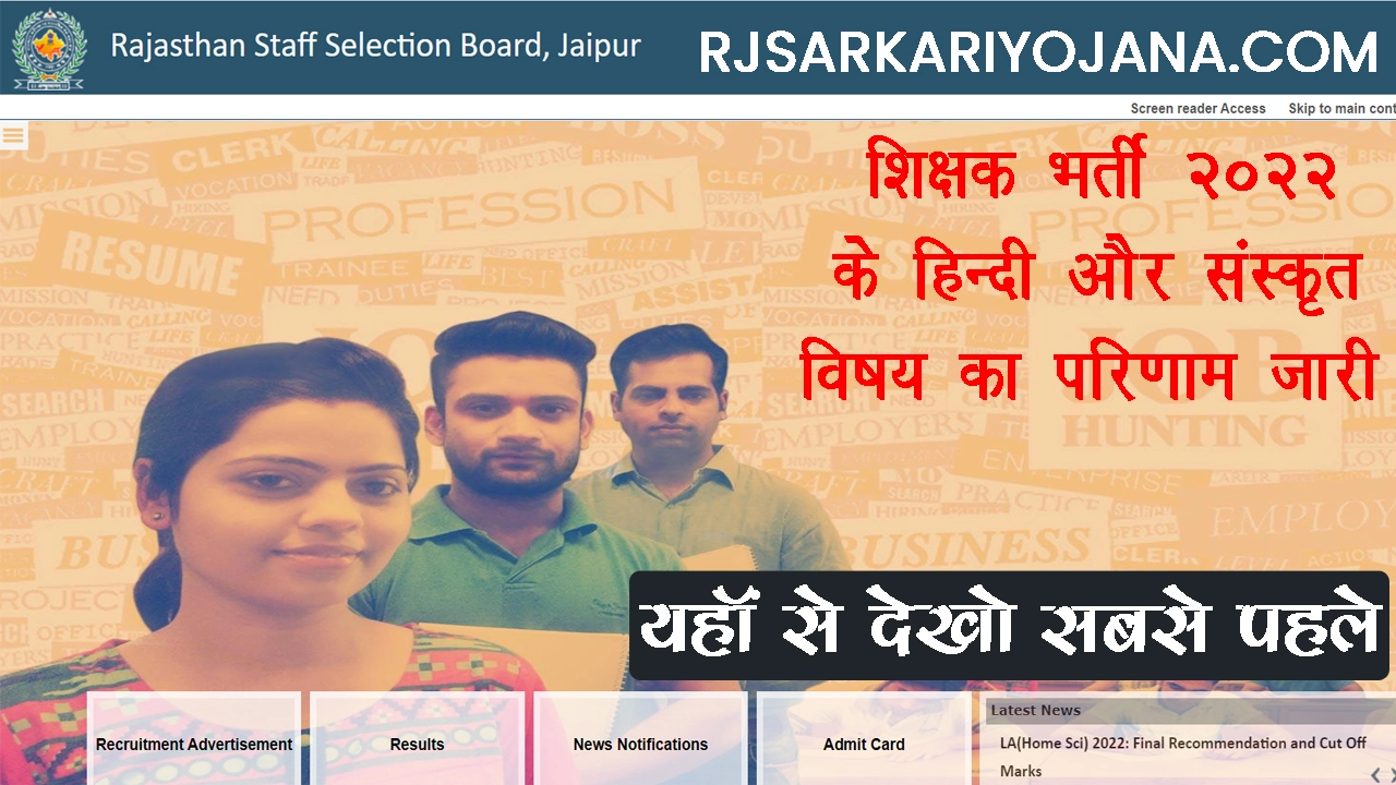 राजस्थान कर्मचारी चयन बोर्ड की और से Rajasthan Upper Primary School Teacher Bharti 2022 Result जारी , आज शाम ६ बजे कर्मचारी चयन बोर्ड ने शिक्षक भर्ती २०२२ के हिंदी और संस्कृत विषय के परीक्षा परिणाम जारी कर दिए है , आइये तो अब जानते है की Rajasthan Ups Teacher Bharti 2022 Result कैसे देखें | आइये तो देखिये सबसे पहले अपना रिजल्ट यहाँ से , वो भी बिना किसी देरी के |